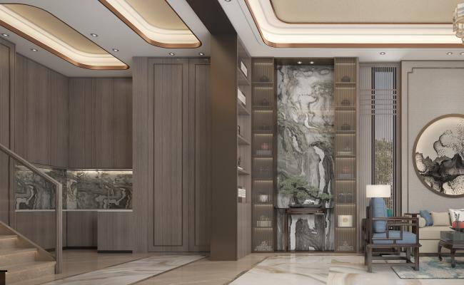 空間以可可蛋奶色系與淺灰為基底,雕花穹頂垂落水晶光瀑。復(fù)式層階以弧形曲線延展,鎏金勾邊如凝固的旋律。巖板樓梯與琺瑯玻璃裝飾對話歲月,古董鏡廊折射流動光影。摒棄浮華堆砌,于凡爾賽式骨架中留呼吸之白,終將古典魂靈凝練為當(dāng)代謐境,成就一處可棲心的精神殿宇。