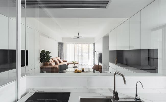 此項目房子花園特別大,房子四周都是窗戶,為了讓室內的人看到外面,外面的人看不到里面,因此以面紗的含蓄和內斂的為目的,用面的設計手法 為空間載體,成為有伴琵琶半遮面的空間氛圍,空間材質均用樸素面質感材質。