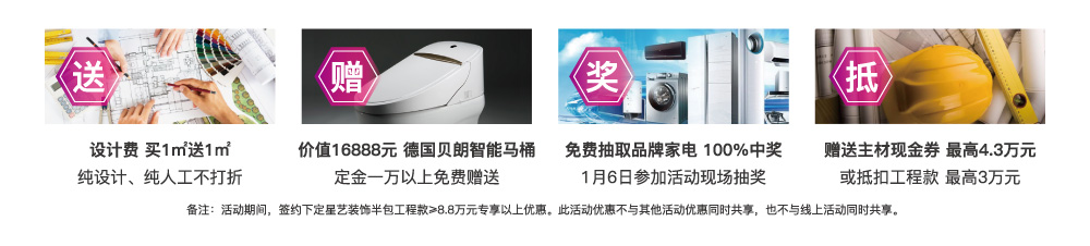 活動(dòng)期間下定,除了享受不漲價(jià)特權(quán),還有豐厚的活動(dòng)福利。設(shè)計(jì)五折、材料萬(wàn)元補(bǔ)貼,簽單即送價(jià)值16888元德國(guó)進(jìn)口貝朗智能馬桶、多功能麥?zhǔn)仯性医鸬八图译姶蠖Y,美的冰箱,海爾洗衣機(jī),掃地機(jī)器人,九陽(yáng)電磁爐等,100%有獎(jiǎng),品質(zhì)家電有保障,拎包入住更省心!
