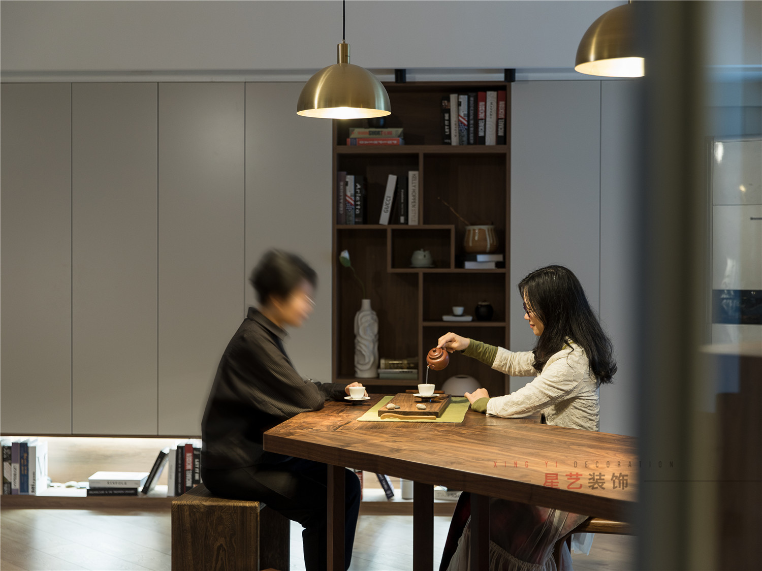 餐區才是家庭的主要活動區域,設計師特意訂制了超大的異形實木桌,滿足客戶用餐、辦公、泡茶談琴、寫字與孩子做作業的功能。