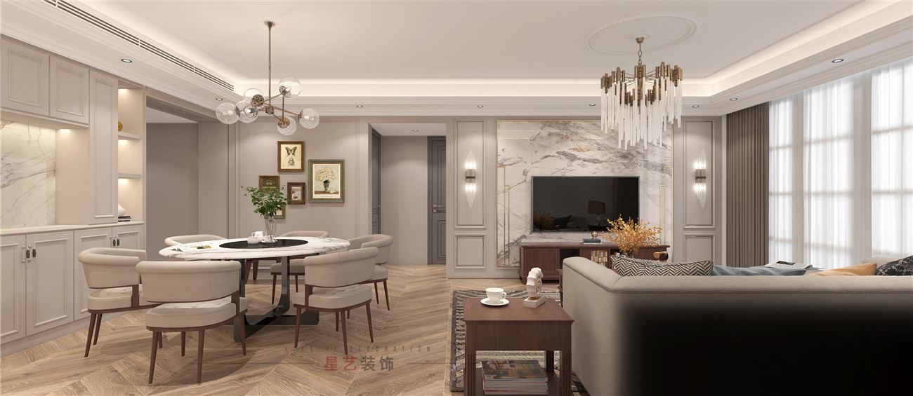 客廳作為主要的待客區(qū),進(jìn)了門就可以看到主要的休閑區(qū)和用餐區(qū),因?yàn)檎w空間上會(huì)比較低矮平和,所以在選材上也會(huì)偏向于舒適,柔軟,溫馨的材質(zhì)組合,可以建立出溫馨的家庭氛圍,兩種的不同精致華麗得吊燈也為客廳和用餐區(qū)劃分出區(qū)域。