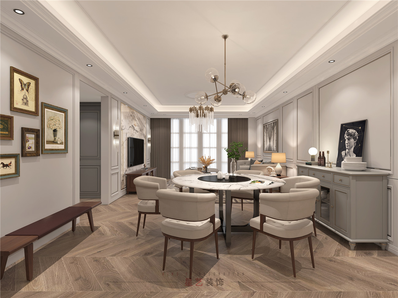 整個(gè)用餐區(qū)還是比較寬敞的,兩邊的墻面都有用掛畫(huà)來(lái)裝飾,旁邊就配置了櫥柜部分,好看又實(shí)用,整個(gè)布局顯得包容又大氣,讓每個(gè)家庭成員都可以回家釋放心中的壓力和解放心靈。