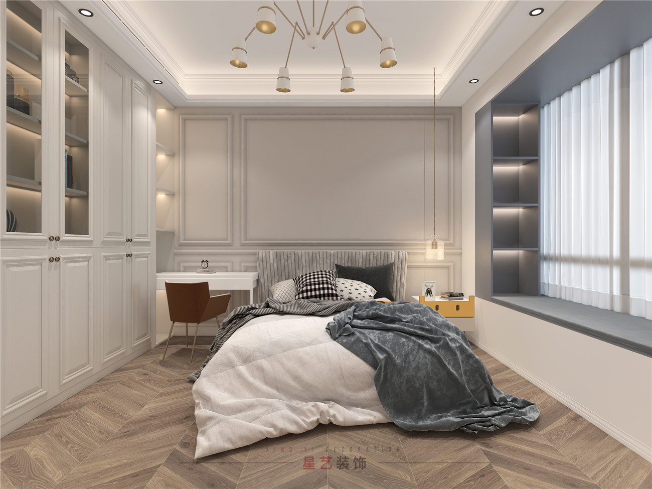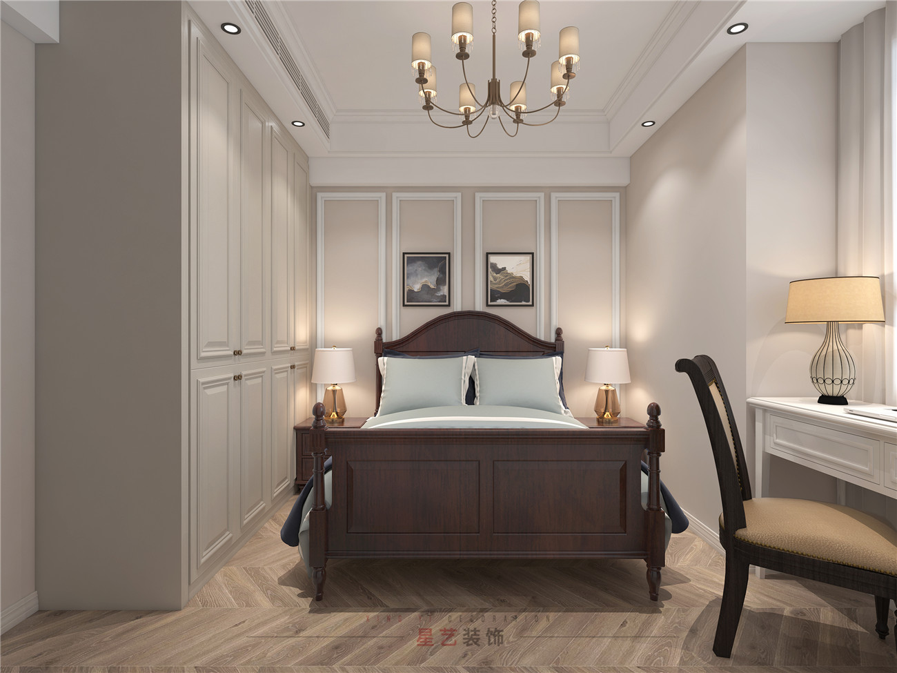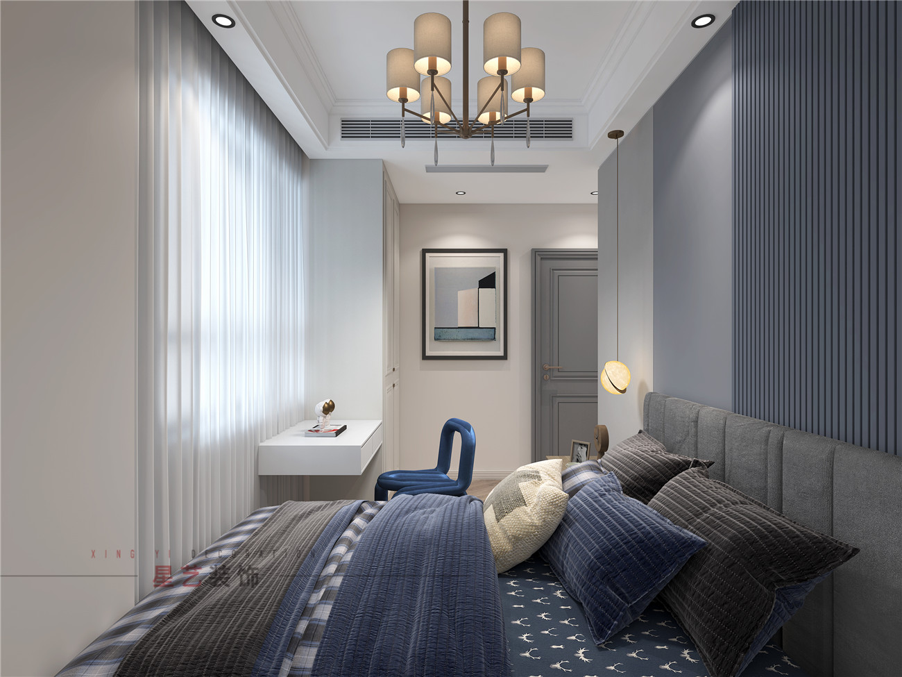 保姆房稍微小一些,但總體來(lái)說(shuō)也是簡(jiǎn)約舒適,主要采用藍(lán)灰色為主。房間有不同風(fēng)格的美式吊燈,增加每個(gè)空間的奢華感,精致感,讓每個(gè)家庭成員都能在這樣溫暖舒適的環(huán)境中找到家的歸屬感。