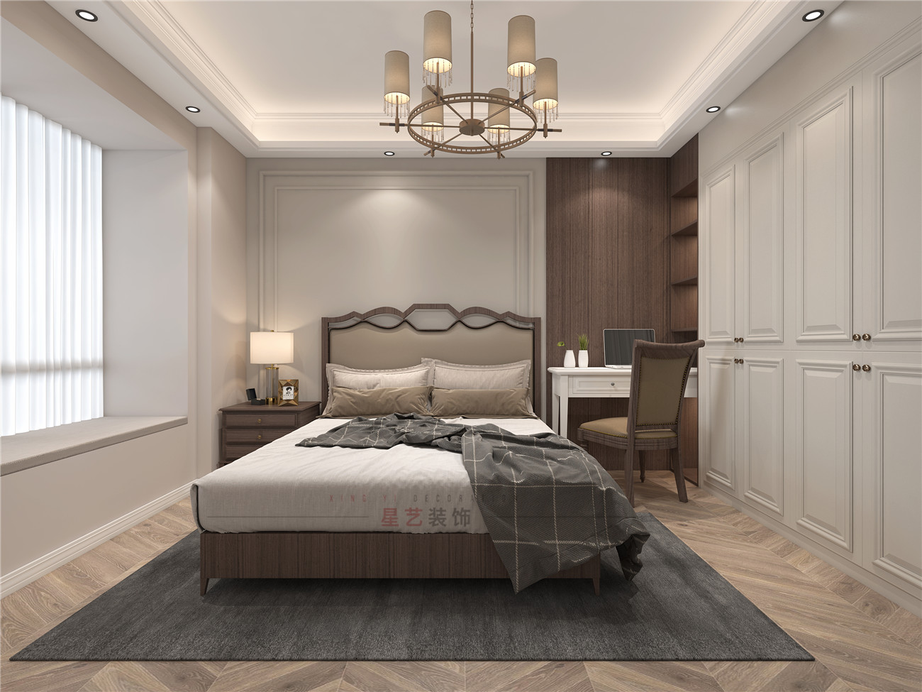 長(zhǎng)輩房保留了比較傳統(tǒng),對(duì)稱的設(shè)計(jì)部分,深色復(fù)古的大床在米白色的空間里顯得格外莊重,沒(méi)有太多得顏色搭配,主要還是保留了一體的設(shè)計(jì)風(fēng)格。