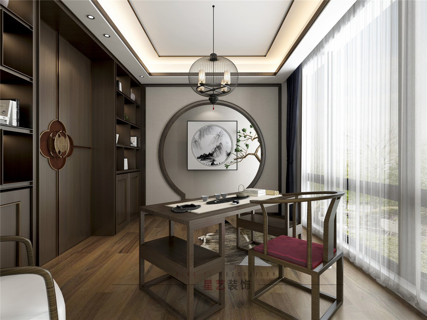 書(shū)房采用燈籠形狀的吊燈的,并且拱門(mén)也是一大亮點(diǎn),用水墨畫(huà)與盆栽做裝飾,顯得格外清幽雅致。