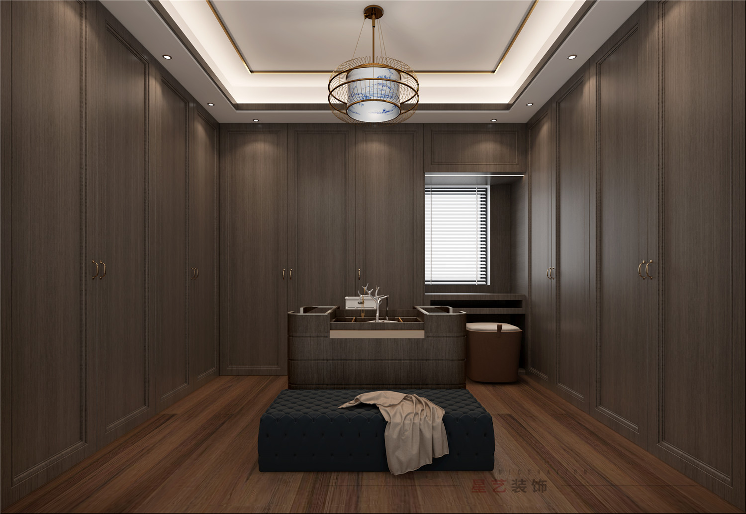 衣帽間大面積深棕色衣柜和黑色換鞋凳顯得有些沉悶,但白色鑲邊的吊燈和青花元素極好的綜合了整體壓抑的氛圍。