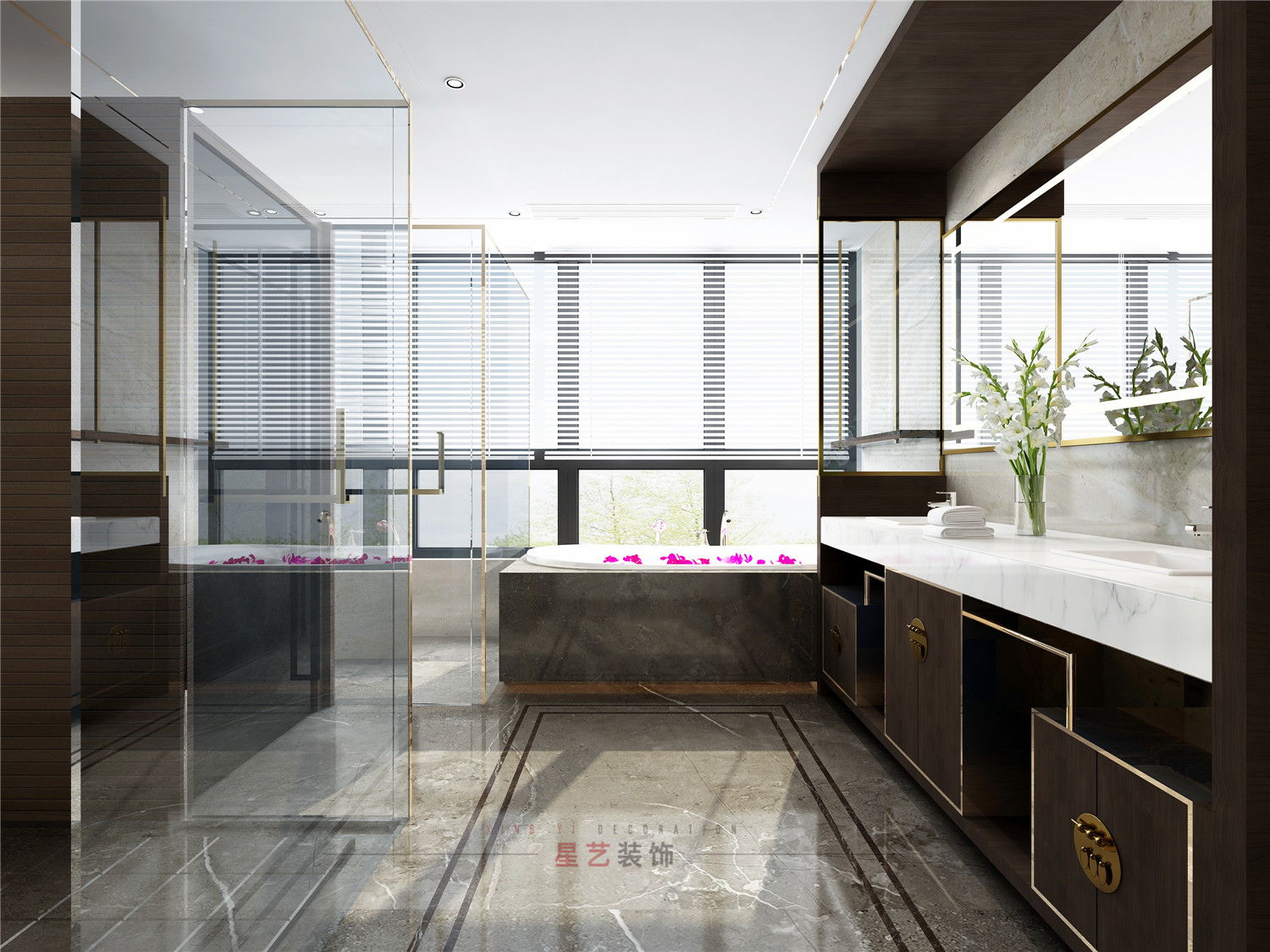 主衛(wèi)大面積的百葉窗和玻璃門(mén)來(lái)打造出虛實(shí)結(jié)合,層次分明的空間,在舒舒服服泡澡的時(shí)候也能欣賞窗外的風(fēng)景,開(kāi)闊的視野更能讓人放松身心。