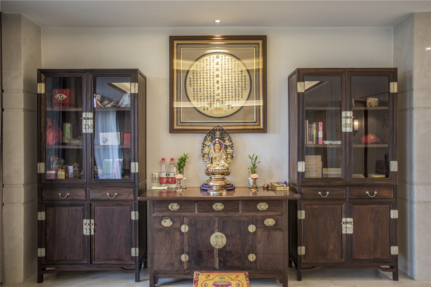 香案兩邊就是置物柜,每天都可以靜下來心來讀經,靜坐。兩兩對稱,四平八穩的長桌置物架放一對木雕大象擺件,在傳統文化中,象與祥字諧音,因此象也被賦予了吉祥的寓意。