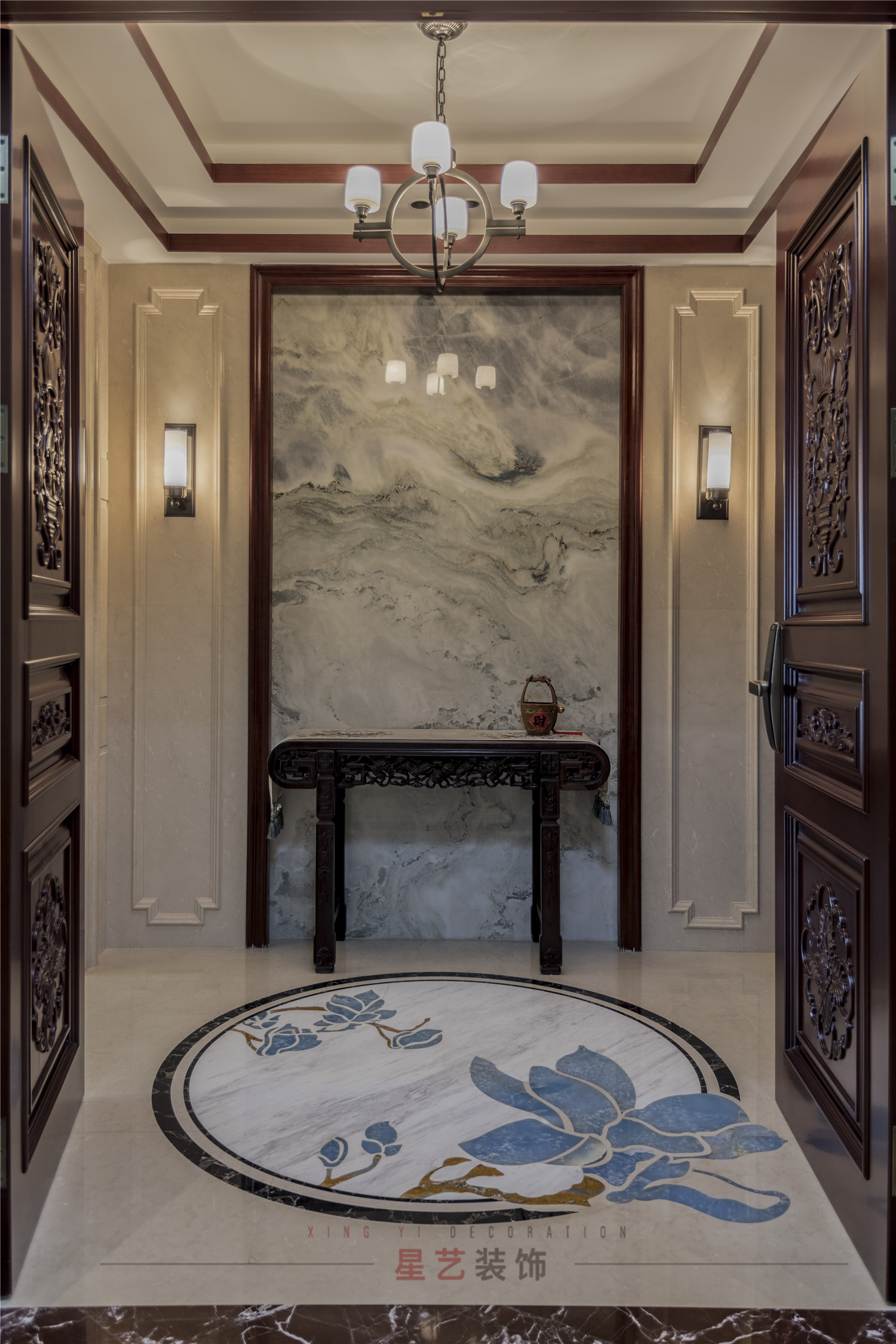 玄關處,推開實木雕花大門,就能看到大理石水墨白充當的山水畫作,行云流水,飄逸揮灑的紋路有著酣暢淋漓的藝術效果,搭配帶有鏤空雕刻的紅木長桌和綻放的淡藍色花朵,更是彰顯了古典文化崇尚自然的詩情畫意。