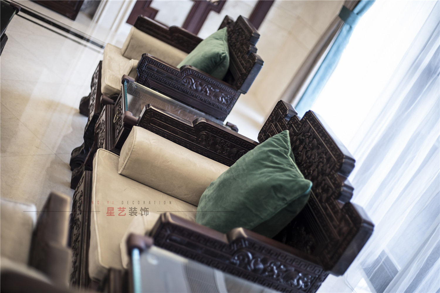 傳統中式主要講究對稱均勻,端正穩重,線條硬朗,這在客廳的設計上體現的淋漓盡致,一整套的紅木家居讓整體風格和諧統一,色彩上深沉而濃烈,顯得格外古樸和傳統韻味十足。