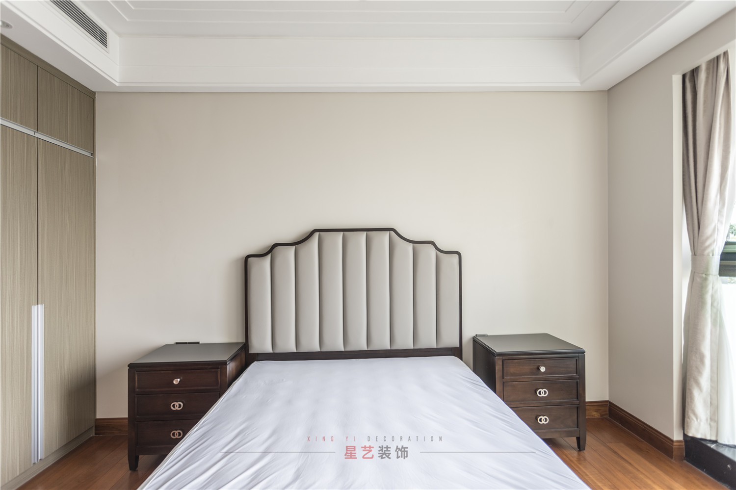 臥室的設計上主要追求簡約自然,保留了對稱的風格,和實木的材質,舒適又有格調。總體風格以文化的韻味+混搭的材質+人性化的功能和設計,成為三代同堂家庭的共同之選。