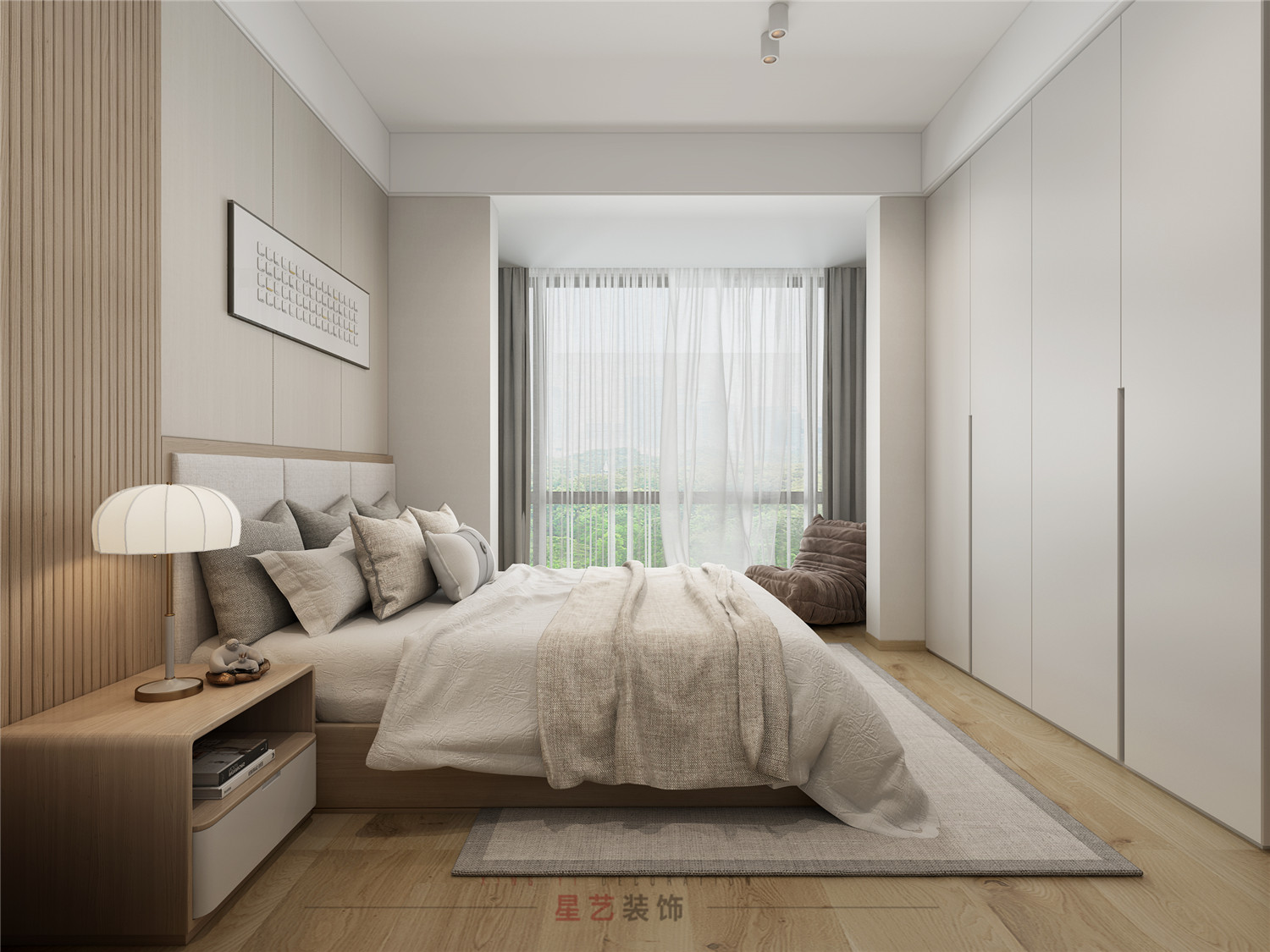 木制紋理地板搭配棉麻風(fēng)格的床上用品